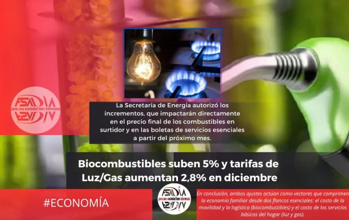La Secretaría de Energía aprobó un aumento de hasta el 5% en los precios de los biocombustibles y, de forma concurrente, las tarifas de electricidad y gas subirán un promedio del 2,8%.