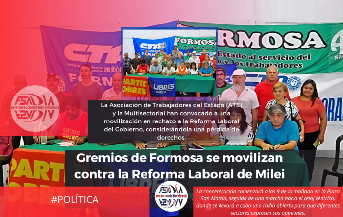 La Asociación de Trabajadores del Estado (ATE) de Formosa, junto a la Multisectorial, han organizado una movilización para el miércoles 11 de febrero en protesta contra la Reforma Laboral impulsada por el gobierno de Javier Milei.