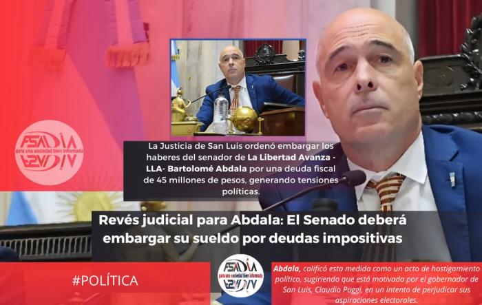 La Justicia de San Luis dictó una orden que afectó directamente al senador Bartolomé Abdala, instruyendo al Senado de la Nación a embargar sus haberes debido a una deuda fiscal que asciende a 45 millones de pesos. Esta deuda corresponde a impuestos y tasas provinciales que el senador ha dejado impagas.
